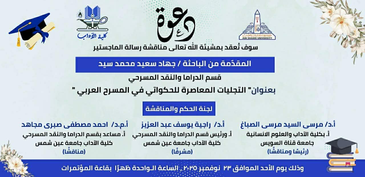 تناقش الباحثة جهاد سعيد محمد سيد يوم الأحد 23 نوفمبر 2025، الساعة 1 ظهرًا، بكلية الأداب جامعة عين شمس رسالة الماجستير بعنوان (التجليات المعاصرة للحكواتي في المسرح العربي).