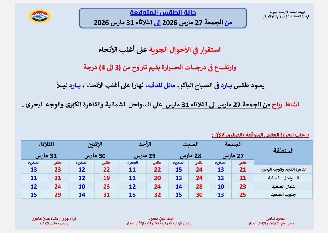 وأوضحت هيئة الأرصاد الجوية أنه اعتبارًا من حالة الطقس غدًا الجمعة 27 مارس 2026 يبدأ استقرار الأحوال الجوية على أغلب الأنحاء، مع ارتفاع في درجات الحرارة بقيم تتراوح من 3 إلى 5 درجات مئوية مقارنة بالأيام الماضية.